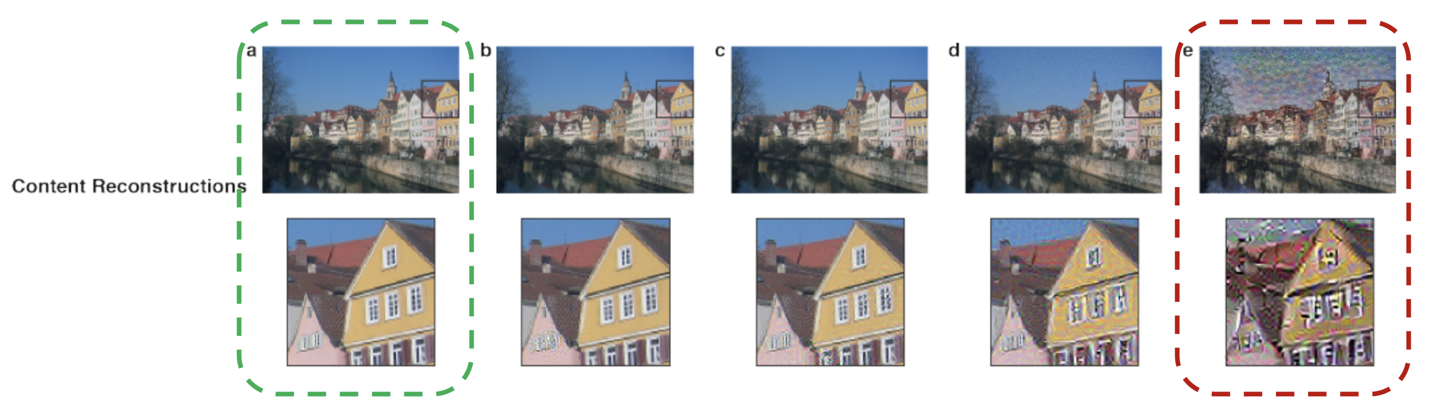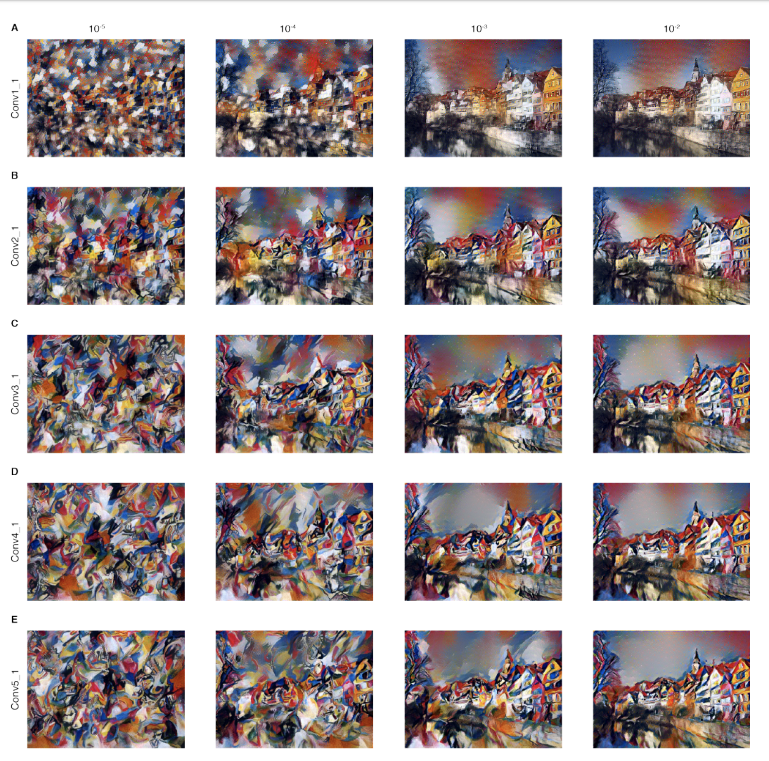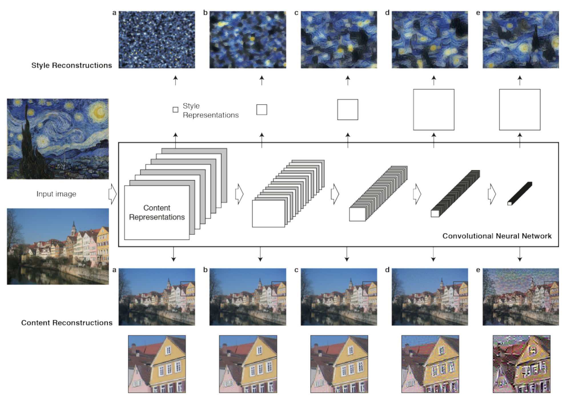 Provided both an input (style) image and a content image, each neuron and respectively each layer in the NN will either activate or it won’t. Each image is processed, or better yet filtered, in a different way (by nature of the activation or not of different neurons). Looking at how the content image is gradually filtered in the above image you will notice that the first layer leaves the image seemingly intact. But looking all the way to the last filtered output you see that this is not the case at all; shapes are there but the inside is not so much the same. This is because of how the resulting high-level features are generated on earlier abstractions of the same image produced by previous layers. This is the intended behaviour to retrieve the content.