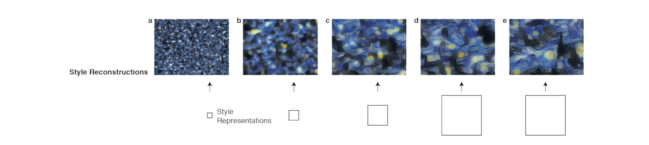 So, for the style, the authors explain that they have built a new feature-space, which focuses on the style of an input image on top of the original CNN representations. The style representation computes correlations between the different features in different layers of the CNN. They reconstruct the style of the input image from style representations built on different subsets of CNN layers and this results in images that match the style of the input on an increasing scale while discarding information of the arrangement of the scene.