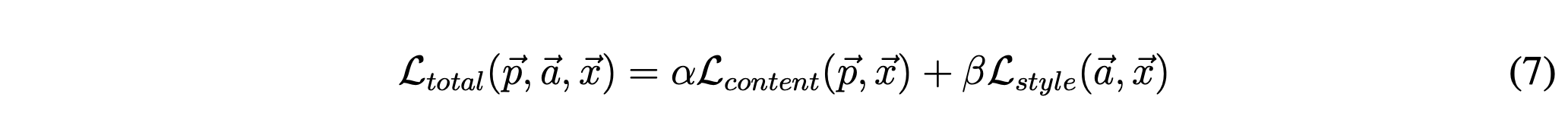 The objective of the formula is to minimize $\mathcal{L}_{total}$. $\overrightarrow{x}$ is the image that we are gradually building through multiple iterations and it initially comes either from the photograph ($\overrightarrow{p}$) or it is initialised as white noise. $\alpha$ and $\beta$ are the weights that we need to set, and they are basically our hyper-parameters in this problem.