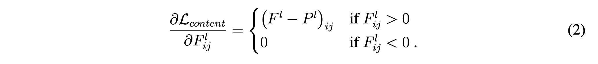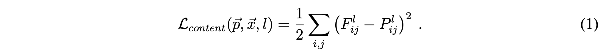 $P^l$ and $F^l$ are the respective feature representations for the two images in layer $l$. The authors used the feature space provided by the 16 convolutional and 5 pooling layers of the 19 layer VGG Network.